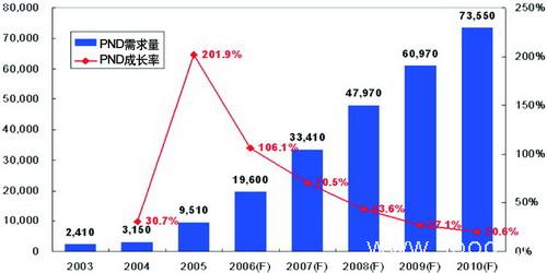 虽然PDA市场自2002年起面临SONY等厂商陆续退出,HPQ、Acer、ASUS与Palm等PDA厂商仍积极致力于在既有功能上增加其附加价值以提振萎靡不振的市场,其中以整合主动式(蓝牙、RS232或USB)或被动式(外插PCMCIA、 SDIO或CFIO接面接收模块) GPS接收模块的PDA或Pocket PC产品为近来最热门的产品,不过由于GPS接收模块信号接收质量不佳定位误差仍超过30公尺,加上因芯片价格过高而影响其整体售价,初期虽备受期待但最终仍无法获得消费者的青睐,尽管PDA或Pocket PC定位误差问题随着2004年SiRF第二代与第三代GPS接收芯片的问世,大幅提升定位误差至15公尺,不过随着PDA手机整合GPS以及GPS手机陆续推出,PDA/Pocket GPS产品逐渐面临功能价值降低与产品定位逐渐模糊等困境,2005年底起即遭受GPS手机的挤压而影响其出货,预估PDA/Pocket PC GPS产品将由2003年的189万台微幅成长至431万台,为PND中成长量及幅度最小的产品,如图10所示。