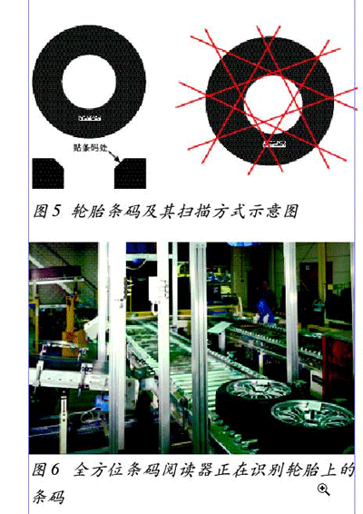 在汽车制造业中,全方位条码阅读器首先被用于轮胎的条码识别中(见图6)。长期以来,轮胎条码的识别一直是条码识别的一个难点,这主要是由于轮胎条码识别的特殊性决定的。首先,由于轮胎上贴条码的位置受到限制,因此条码的高度一般都比较小,而且贴在斜面处,这对阅读条码非常不利。其次,由于轮胎通过传送带的传送后条码的方向是随机的,条码可能以任何角度进入阅读区域。由于条码高度很小,采用90°交叉的扫描线很难达到较好的扫描效果。为此,我们采用了8条交叉的扫描线对轮胎条码进行扫描,其中相邻两条扫描线之间的夹角为110°,如图5所示。采用此系统在生产现场对贴有Code 128码(分辨率10mil)的轮胎进行实际测试,阅读率达到98%以上。由此可见,全方位条码阅读技术能够为轮胎的自动识别提供一套非常有效的解决方案。