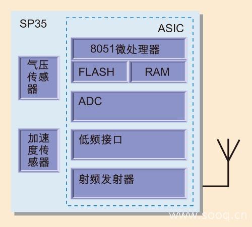 SP35集成了气压传感器、加速度传感器、温度传感器、搭载片上闪存的8051微处理器、低频接收器接口以及315/433/868/915MHz射频发射器。除减少组件数量外,它还可以降低系统总体成本,因为板卡设计更加简单,尺寸更小。