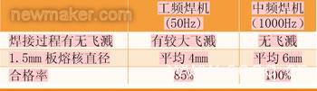 从表1可见对于多层板的焊接,无论从操作环境,还是从焊点质量及其稳定性,中频焊机的焊接性能都明显优于工频焊机。由于中频焊机的电流非常接近直流电流,焊接时没有电流峰值,焊接过程中热量增加比较稳定无波动,因此焊接飞溅很少,甚至几乎没有。所以中频焊机的操作环境较工频焊机操作环境好很多,并且中频焊机的电流热效率高于交流电流,故中频焊机焊接的焊点熔核直径比工频焊机的大1~2mm。