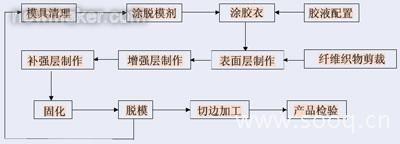 图2所示为手糊成型工艺流程。从该工艺流程可以看出,手糊成型工艺具有以下优点:不需要复杂的设备和模具,投资低;生产技术容易掌握,且产品不受尺寸形状的限制,适合小批量和大型制件的生产;可与其他材料如金属、木材及塑料泡沫等同时复合制成一体。这些优点使得手糊成型工艺至今仍然作为汽车复合材料的一种主要成型工艺而被用于小批量地加工各种汽车复合材料制品,如客车和重型卡车的前/后围面板、高顶、导流罩、引擎罩盖、保险杠、挡泥板以及休闲车、农用车的车身等。此外该工艺还被用于新车开发,如制造概念车和新车样件试制。