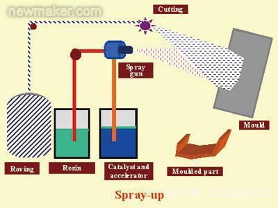 与手糊成型工艺相比,喷射成型工艺的效率提高了2~4倍甚至更高。其优点是:由于使用无捻粗纱代替了手糊工艺的玻璃纤维织物,因而材料成本更低;成型过程中无接缝,这使得制品的整体性和层间剪切强度更好;可自由调节产品的壁厚、纤维与树脂的比例以及纤维的长度,因而满足了汽车零部件的不同机械强度要求。由于喷射成型工艺具有效率高、成本低及产品尺寸形状不受限制的优点,因此该工艺在国外汽车复合材料行业中,有逐步取代传统的手糊成型工艺的趋势,例如,客车和重型卡车的很多前/后围面板、侧面护板、高顶及导流罩等都已由喷射成型工艺制作。