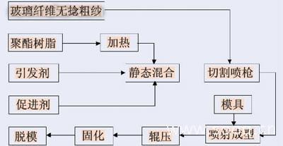 图4所示为喷射成型工艺(Spray Up Molding)示意图。该工艺是将混有引发剂和促进剂的两种聚酯分别从喷枪两侧喷出,同时将切断的玻纤无捻粗纱由喷枪中心喷出,使其与树脂在空间均匀混合后沉积到模具上。当沉积到一定厚度时,用压辊滚压使纤维浸透树脂,排除气泡,在经常温固化后成型为汽车复合材料制品。喷射成型工艺是在手糊成型工艺的基础上发展起来的。由于该工艺是借助于机械的手工操作工艺,因此也被称为“半机械手糊成型工艺” 。图5所示为该工艺的工艺流程。
