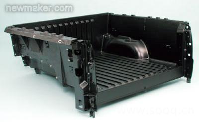 模压成型工艺的不足之处在于模具制造复杂,投资较大,加上受压机限制,使其更适合于生产中、大批量的汽车复合材料制品(热固性汽车复合材料制品在100000件/年以内,热塑性汽车复合材料制品在1000000件/年以内)。随着金属加工技术、压机制造水平及合成树脂工艺性能的不断改进和提高,压机吨位和台面尺寸不断增大,模压料的成型温度和压力也相对降低,使得模压成型制品的尺寸逐步向大型化发展,目前已能生产的大型汽车部件如模压重卡高顶、MPV车顶、皮卡车厢、重卡驾驶室侧围板等。图15所示即为模压成型工艺生产的2001福特Explorer Sport Trac SMC皮卡车厢。