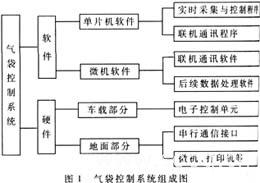 气袋控制系统硬件由两部分构成,一部分是车载部分的电子控制单元,包括控制单片机、传感器、点火电路、指示灯电路等;另一部分是地面部分,包括串行通讯电路和计算机系统,以及打印机等后处理设备。