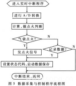 数据采集与控制程序主要负责实时数据采集,使用点火算法对所采数据进行计算并作出判断,发出点火信号。在点火后还要设置状态代码进行数据保存等工作。为了全面分析不同的事故情况, 对不够点火条件但仍有一定强度的事故也要记录其波形,使系统具备"黑匣子"的功能。其流程如图5所示。