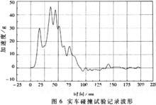 使用某型号国产轿车做控制系统的实车试验,实测碰撞速度为49.2km/h。控制系统准确地点爆了气袋,并记录了数据。图6为这次试验控制系统记录的碰撞波形。