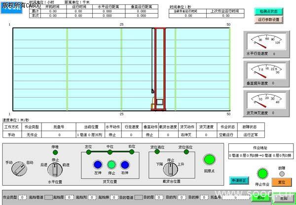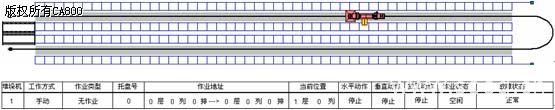 监控系统提供平面示意图和状态表格,包括仓库运行平面示意图、堆垛机运行状态显示图、作业进程表、故障明晰表。可显示堆垛机的使用情况(包括开机时间、运行时间、水平运行距离、垂直运行距离及其累计值)、堆垛机和载货台的位置、货叉的负载情况。在列表中显示堆垛机的工作方式、作业类型、作业地址、托盘号、当前位置及作业运行情况(包括水平运行状态和速度货叉运行状态以及作业状态等)。当堆垛机运行状态处于自动运行状态时,在监控机上可以控制堆垛机的单步运行。设置堆垛机的运行状态为监控手动,可以控制堆垛机的水平运动、载货台的垂直运动、货叉的伸收,并监视运行到位状态。