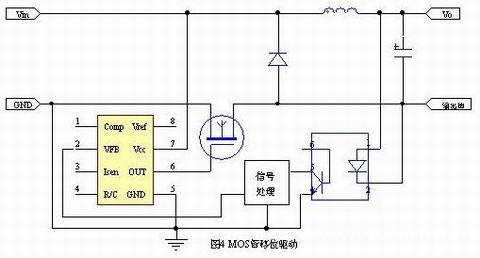 如图四所示,将MOS管移到供电电源的负端,就可用IC输出的信号直接驱动。优点是驱动成本低,缺点一是输出地悬浮,抗干扰性差;二是不能直接引进反馈,需要再加光耦隔离传送。
