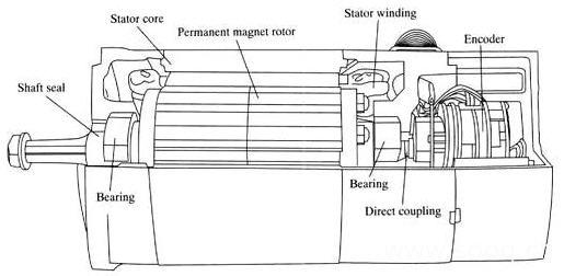 有些变化,必须作出任何运动,目的是作为伺服在cludes的能力,运作了一系列的速度没有过热,运作的能力在零速度和保持足够的转矩举行负荷的立场,运作能力在非常低的速度很长时间没有过热。老年型发动机冷却风扇已是直接连接到电机轴。当电机运行速度缓慢,风扇不会移动足够的空气冷却的发动机。较新的发动机有一个单独的风机安装,以便将提供最佳的冷却空气。这扇是由常数电压源,以便它反过来将在最大转速在任何时候都不管的速度伺服。其中最实用类型的电机伺服系统是永久磁铁(下午)型发动机。电压为外地绕组永磁型电机可以交流电压或直流电压。永磁型电机类似于其他类型电机下午以前提出。图11-83显示了剖图片的永磁电机和图。 11-84显示了剖图的永磁电机。从图片和图表可以看到住房,转子和定子都期待非常相似,前型永磁电动机。主要的差异这种类型的发动机,它可能减少齿轮能够将更大的负荷迅速从一个站着不动的位置。这种类型的永磁电机也有一个编码器或解析器内置马达的住房。这确保了设备将准确地表明了立场或速度的电机轴。