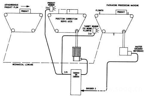 第五,提出申请图。11-94,显示了一系列的包装设备,可作为三个独立的机器。时间周期的每个车站的包装系统是独立于其他人。包装系统包括一个料输送机,输送定位和包装站。该料输送和包装机械站连接,使它们运行在相同的速度。的立场包的包装站必须严格控制,使包装不会成为太接近对方。一片金属所谓的飞行协商nected的包装输送站的具体点,以确保每包留在的位置。传感器安装在年初的定位,确定输送前缘包时,开始走上定位输送。第二个传感器是处于底部的传送带包装检测航班。这两个信号的传感器传送到马达,提供信息,以便伺服可以调整的速度定位输送,使每个包赞同之一的飞行动作,因为它的包装上传送带。此应用表明,该伺服定位控制器能够处理各种不同的信号,从多个传感器,因为该控制器采用微处理器。