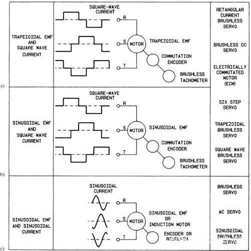 图11-85显示三种类型的电压波形,可用于功率无刷伺服电机。图11 - 85a显示了梯形电动势(电压)输入和方波电流输入。图11 - 85b显示波形的正弦输入电压和方波电流波形。图11 - 85C号显示了正弦输入波形和正弦电流波形。正弦输入和正弦电流波形是最受欢迎的电压用品的无刷伺服电机。