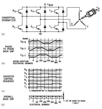 图11-86表明三套晶体管类似的晶体管输出级的变频驱动器。在图。11-86a晶体管相连的三个绕组电机以同样的方式在变频驱动器。在图。一升-86b图的波形的输出晶体管表现为三个不同的正弦波。波形的控制电路为基础,每一个transis器中显示图。11-86c。图11-86d表明了反电势的驱动波形。