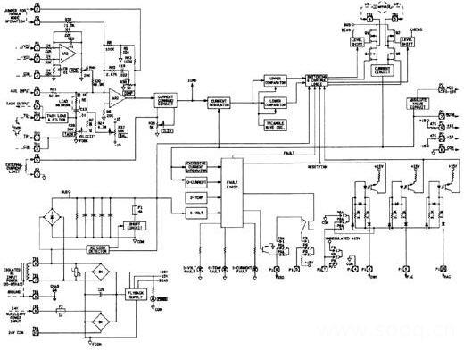 其余的电路显示了各种故障电路中的图表来自故障的逻辑电路板,并提供输出信号的底部图。你应该注意到,故障输出信号,包括过电压, overtempera结构和过。第四个信号是确定的SSO (系统状态输出),其中在dicates的地位,系统故障故障随时发生。跳投是用来确定信号的SSO作为一个开放集电极输出的逻辑电平“ 1 ”表明该驱动器已准备好,或者作为中继通常关闭显示驱动器已准备就绪。