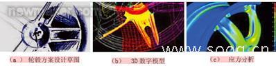 铝轮毂设计开发的主要方法和流程是:市场调研、收集顾客需求和设计输入等信息;综合各种信息,绘制轮毂方案设计草图并讨论研究(如图1a);方案初步确定后,利用三维软件(如CATIA)将轮毂由方案草图变为3D数字模型(如图1b),对设计进行评审并与顾客交流;3D设计完成后,利用CAE软件(如ANSYS软件)进行轮毂的应力分析(如图1c),根据分析的受力情况进行结构和重量的优化设计再与顾客交流;优化设计完成后,采用快速原型制造技术制造出轮毂的实物模型,与顾客共同对实物进行评审;同步完成铸造模具的设计,利用CAE软件(如MAGMA软件)进行铸造过程模拟分析,优化模具设计和工艺方案设计;制造并试验模具,生产制造出真正的样轮;对制造出来的样轮进行各种性能试验和路试,只有样轮经过充分地试验,证实其在行驶中的表现是优秀的,一个新的铝轮毂开发设计才算完成。
