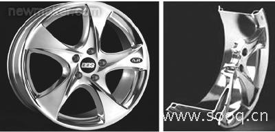 两件组合式内置空气铝轮毂的简要生产流程是:低压铸造→热处理→局部加工→旋压形成空腔→激光焊接→加工→涂装→用螺栓组装轮毂。