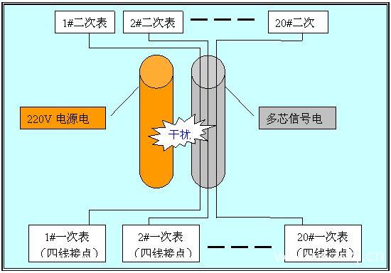 方案一:全部更换受干扰的信号线。重新布槽线盒,更换多线电缆为三芯电缆,每块一次表单独一根电缆。