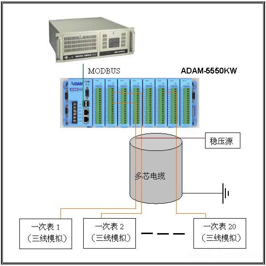 现场信号直接连接到AI卡ADAM-5017的端子上,用ADAM-5550KW采集到信号值并进行处理后,将数据放入MODBUS存储区;采用MODBUS TCP协议传至工控机,再由开物2000软件完成图形显示。