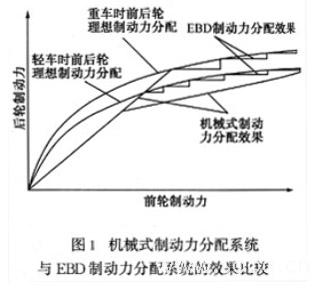 图1对安装机械式制动力调节装置和安装电子制动力分配系统EBD的制动力的调节性能进行了比较,从中可以看出,虽然机械式制动力调节装置可以避免后轮先抱死,但制动力调节性能曲线与轻、重车理想的制动力分配曲线相差较大,制动效率低。而电子制动力分配系统不管是轻车还是重车条件下,都能产生锯齿形的压力调节作用,使制动力曲线与理想的制动力分配曲线拟合率较好,制动效率较高。