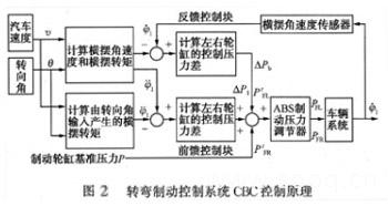 汽车转弯时有较大的离心力,尤其车速较高时更是这样,此时对汽车实施制动,既要保持汽车的横向稳定性,又要有良好的制动效果,仅有ABS十EBD是不够的。转弯制动控制系统CBC的作用是,当汽车转弯制动时,通过调节汽车两侧车轮制动轮缸中的制动压力,使外侧车轮在制动过程中获得更大的制动力。