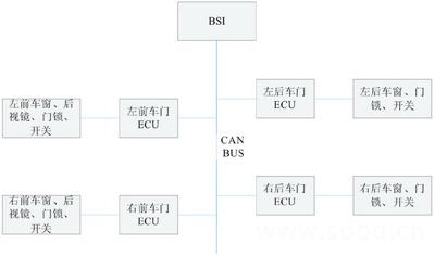 车门控制系统采用总线式拓补结构,总线一般采用低速CAN总线或LIN总线,采用不同总线协议和不同的拓补结构可以提供不同程度的智能。第一种方案是每个车门采用一个集中控制的CAN节点,BSI和四个车门通过一个CAN网络连接,如图1所示。