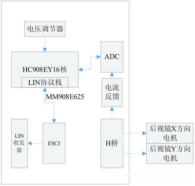 后视镜节点方案如下图所示,实现对后视镜上下、前后两个方向的位置调整,实现折叠功能和加热功能,采用飞思卡尔的智能分布式控制单芯片MM908E625实现,MM908E625是一个高度集成的单封装解决方案,在一个SOIC54的封装内集成了HC08内核和SmartMOS模拟控制IC,该模拟控制IC包括LIN物理层收发器,电压调整器,4个半H桥和一个高端开关,采用半H桥实现对后视镜电机的驱动从而实现位置调整和折叠,利用高端开关实现后视镜加热。
