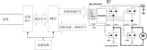 车窗节点方案如下图所示。实现车窗升降及防夹,采用带电流反馈的智能功率驱动芯片,设计基于电流反馈的小算法,可以实现防夹功能。当车窗电机启动后,经过百毫秒级的时间便可以平稳运行,在这段启动时间后对驱动芯片的电流反馈值取样,经车窗ECU上的MCU内的ADC采样与阈值比较,如果碰到障碍物,车窗电机运转电流增大,ADC采样值超过设置的阈值,这时认为碰到了障碍物,MCU控制驱动芯片停止对车窗电机的驱动,从而实现了防夹。