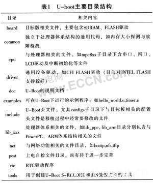 U-Boot(全称U niversal Boot Loader)是遵循GPL条款的开放源码项目。其源码目录和编译形式与Linux内核相似。事实上,不少U-Boot源码就是相应的Linux内核源程序的简化,尤其是一些设备的驱动程序,这一点从U-Boot源码的注释中就能体现。目前支持的目标操作系统有OpenBSD,NetBSD,FreeBSD,4.4BSD,Linux,SVR4,Esix,Solaris,Irix,VxWorks,LynxOS,pSOS,QNX,RTEMS,ARTOS;这是U-Boot中Universal的一层含义,另外一层含义是U-Boot除了支持PowerPC系列处理器外,还能支持Black-fin、MIPS、x86、ARM、NIOS、XScale等诸多处理器。上述两个特点正是U-Boot项目的开发目标,即支持尽可能多的嵌入式处理器和嵌人式操作系统。U-Boot的主要目录结构如表1所列。
