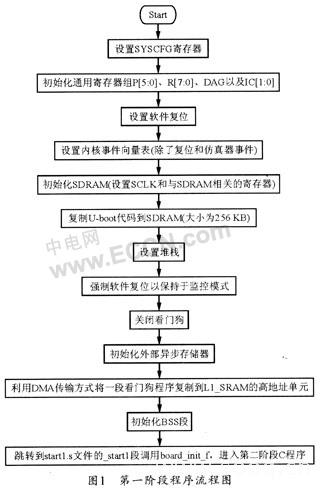 依赖于CPU体系结构的代码(比如设备初始化代码等),通常都放在stage1中,该代码可用blackfin DSP汇编语言来实现,以达到短小精悍的目的。实际操作可在位于U-boot 1.1.3\cpu\bf533中的Start.S和Startl.S文件中实现,而且是从Start.S开始运行,此阶段的程序流程图如图1所示。