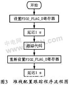 添加的跟踪堆栈配置程序的流程图如图3所示。修改代码后即可在U-boot文件夹路径下依次输入以下命令:make clean、make mrproper、make ezkit561 config和make,然后再利用bfin-u.clinux-objcopy将生成的U-boot.bin转换为U-boot.hex,最后通过VDSP++开发环境中TOOL下的flashprogrammer将u-boot.hex烧写到flash中,同时进行复位操作以观察LED的变化。