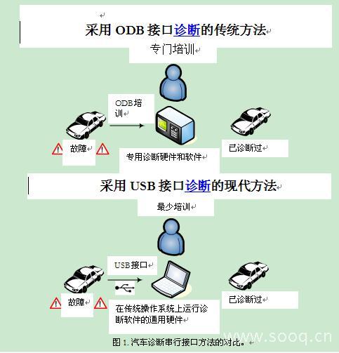 USB应用于汽车诊断系统上是一个趋势,这种趋势在未来的五至七年还会增长。通信端口不是一个新概念,它有助于维修技术人员将一个专用测试设备接到汽车控制局域网(CAN)总线的诊断端口。汽车上的车载自动诊断系统(ODB)接口标准已经有超过25年的时间了。随着这些网络从ODB标准转移到USB,它们最终将降低服务、维护和保证成本的原因有两个。第一个原因是:考虑控制器、物理层收发器、相关计时元件和连接器时,USB的每个设备节点的成本要低于CAN节点的1/2。第二个原因是:低成本硬件(如PC、PDA,等等)和软件的广泛应用可用来开发低成本的诊断设备。传统ODB方法与新型USB方法的对比如图1所示。