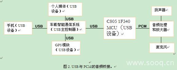 在音频系统和车载智能通信系统之间的桥接应用方面也有显著增长。例如,今天许多导航设备既能向驾驶者提供声频导航,又能接收来自驾驶者的音频指令(例如“请带我去最近的加油站”)。在这些情况下,诸如Silicon Labs C8051F340的微控制器能为导航或车载智能通信系统控制台总线和音频子系统的脉码调制(PCM)总线提供一个USB桥接。这种方法支持扬声器和麦克风之间的全双工音频通信,如图2所示。