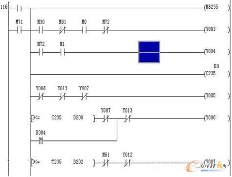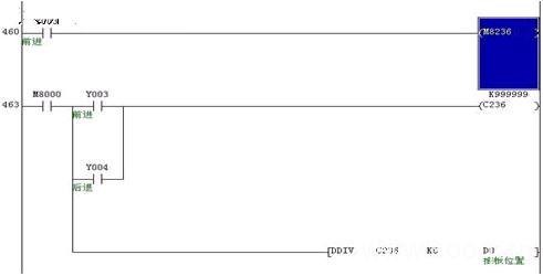 编程中其它应注意的问题。一是双线圈问题。本工程中利用条件跳转和步进指令避免了双线圈问题。二是误信号问题。编码器是一种比较精密的光电产品,受振动时不可避免的会出现误信号,而切纸机在执行裁切动作时会造成很大振动,如果忽视这个现象,定位精度和执行机构当前位置的显示都会不准确。本工程中处理方法参见上面例子程序图1,只有Y3、Y4接通,即只有进给机构前进和后退时才让C236进行计数,这样就屏蔽了裁切时震动造成的误信号。