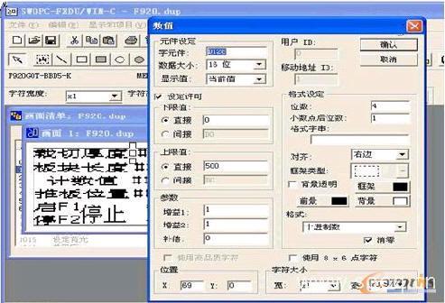 还有一个问题是参数设定时的小数点位问题,实际工作中在设定位置时要精确到0.1mm。这个问题在一些单片机系统中常会遇到,常见的处理办法是加大一个数量级,就是设定数据时,在人机界面上用1代替0.1mm,10代替1mm。不过我们在处理此问题时通过HMI中对数据的设置和PLC的程序编写达到了所见即所得的效果。HMI中主要是对数值的格式要设定好。HMI中的设置画面见下图。