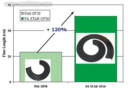 TECHNYL STAR和普通的PA6相比,它的螺旋流动长度增加了1倍