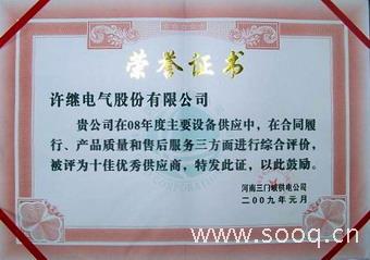 会上,三门峡供电公司公布了2008年度电力设备供应商评级结果。许继电气股份有限公司在合同履行、产品质量和售后服务三方面经综合评价,总分排名第一,被三门峡供电公司评为“十佳优秀供应商”。