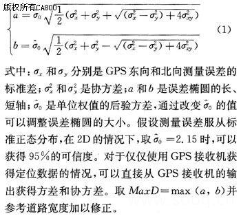 令△Cdistance为GPS值与当前道路投影点之间的距离;△distance为GPS值与其他道路投影点之间的距离;MaxD为预先设定的搜索道路的距离阈值。阈值通常根据概率准则来确定,即必须以一定的概率包含车辆的实际位置。按照统计理论,可首先确定一个误差椭圆: