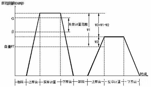 焦炉装煤车主要完成对焦炉各炭化室的装煤操作,是焦炭生产的一个重要环节,其主要工艺流程为:装煤车沿铁轨行走至煤塔下,打开煤塔下煤孔闸板门由煤塔取一定重量的煤,煤料达到要求重量之后,关闭煤塔闸板门,然后行走至计量工位过磅,简称实车计量值W1,行至装煤的炭化室上方将煤料输送到炭化室内,再行走至计量工位过磅,简称空车计量值W2,W1与W2之差既为卸载量W3,如卸载量W1-W2≤α-β,则本次计量无效,如卸载量W1-W2>α-β,从而完成一次周期计量。其装载时序如下图1所示: