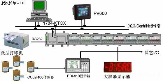 基础控制系统配备FlexLogix控制器1台、8个本地FlEX I/O、PanelView 600人机显示终端1台及微型打印机1台,并采用冗余的ControlNet网络配置和模件级的自诊断功能。处理器1794-L34内置了512k用户内存(包含带电池SRAM和非易失性存储器各512k),它主要适合于面向分布式控制的中小型系统,具备无与伦比的灵活性,就地可扩充多达16个具备热插拔的FlEX I/O,并具有多任务操作系统。FlexLogix处理器内置一个RS-232通讯口(DF1 协议或ASCⅡ协议),它以ASCⅡ协议方式连接现场微打,打印内容包含日期、时间、重量、班次等信息。