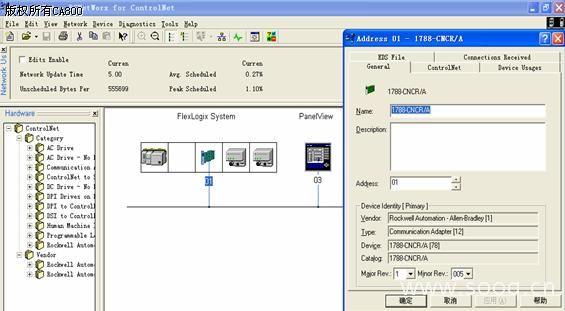 RSNetWorx for ControlNet是应用于ControlNet网络组态的管理软件,主要具备网络配置、参数设定、网络诊断等用途。见图4所示的配置图。