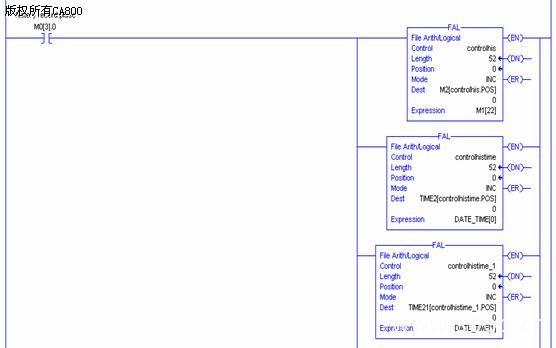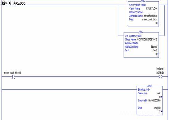 图7所示通过在Logix5000编程软件中应用GSV(获取系统值)指令来取得存储在对象内的控制器系统数据,FAULTLOG对象提供了控制器内部的事件及故障位信息;CONTROLLERDEVICE对象反映了控制器物理硬件的状态信息。应用程序以秒周期对控制器进行周期性扫描,来诊断是否有一般性的故障发生及处理,这样一来即满足于系统对监控工艺的要求,又提高了主流程的响应速度和控制器的资源利用率。