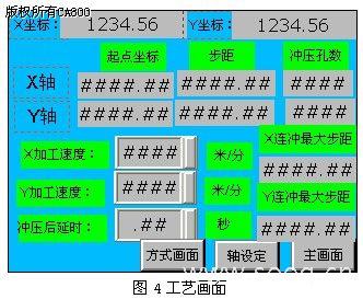 工艺画面如图4所示:在工艺画面可以设置起点坐标、步距、冲压孔数,最大步距加工速度等,对于所设步距大于最大步距时,PLC会判断,等待进给到位信号到来后冲头方可冲下。