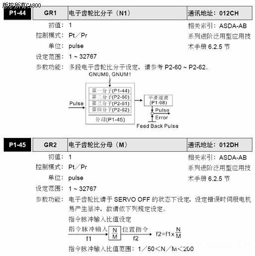 (3)电子齿轮比分子:1-44 = 5 ;电子齿轮比分母1-45 = 2 。
