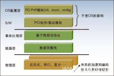 PCI Express采用分层架构,如图2所示。从底层开始分别是物理层、数据层、事务处理层、软件层和OS层。