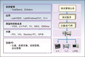 混合多平台测试系统能够将来自多种ATE平台(如PXI、PCI、GPIB、USB和以太网)的设备整合进一个系统中。将多种总线成功整合进同一个系统中时,一个重要任务就是建立如图3所示的分层系统架构。利用这种架构创建的系统,可以最大地发挥已有软硬件投资价值,同时仍能整合新的总线技术。这种架构的关键部分是上面三层,即软件框架,它简化了多种总线的整合、配置和编程。