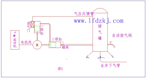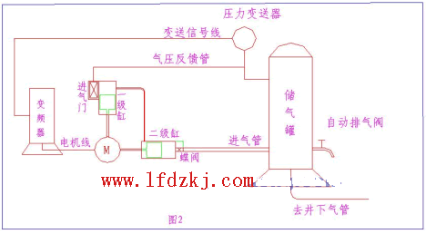 万益电子厂实际使用情况: 在万益电子厂有一台L型立式两台捷豹牌132KW活塞式压缩机,工作额定电流为270A,排气压力为1.0MPA并带储气罐,采用星三角起动。改造前如图一。其井下工作面需气压力为0.7MPA下限为0.66MPA。极限压力为0.8MPA即通过储气罐上的自动排气进行安全保护。平时压缩机进气门打开,如气门通过反馈回来的气罐压力超过0.74MPA,则进气门关闭,电机处于空载运行。电机的空载电流为60A左右。 采用一台型号LF2000-S5-132KW 的磊峰节电器,压力变送器的量程为1.6MPA。由于储气管压力波动小,直接供气给井下的众多的气压冲击钻,所以最能直接反映管网的实际压力,压力变送传感器应安装在储气管上,并且尽量远离蝶阀位置。进气门反馈气管已去掉,进气一直处于打开状态。使用工况如图2。 压力变送器反馈信号4~20mA进入变频器的S2、S3端子,