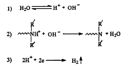 电泳涂装是一种特殊的涂膜形成方法,它是将具有导电性的被涂物浸在盛有用水稀释的、固含量约为10~20%的电泳涂料的槽中作为阳极(或阴极),在槽中另设置与其相对应的阴极(或阳极),在两极间通直流电,在被涂物上析出均一、水不溶的涂膜的过程。根据电泳涂料中水溶性树脂的带电性质,电泳涂装分为阳极电泳涂装和阴极电泳涂装。在阴极电泳涂料里,基体树脂为含有氨基或叔胺基团的阳离子树脂(多为环氧、丙烯酸、聚醋、聚氨醋或其它树脂),通过加入有机酸(多为醋酸、甲酸、丙酸或乳酸等)中和成欲具有水溶性,形成带有 的聚合物, 为聚合物阳离子。当施加电场时,在碱性条件下,阴极周围的 由于与 相互作用,而失去水溶性,并在阴极上以X的形式沉积下来, 在阳极放出电子氧化成酸,这就是阴极电泳涂装的基本原理。