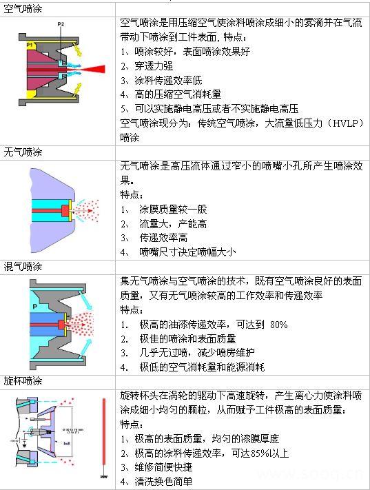 喷涂是借助不同的工作原理将涂料喷涂成细小的雾滴并送到工作表面,目前有四种喷涂方式:空气喷涂,高压无气喷涂,混气(空气辅助)喷涂,离心力喷涂。