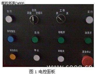 高效率是企业的宗旨,高效率意味着高速度。速度是评定外圈滚道磨床电控系统的重要指标。磨床电控项目选用中达EH2系列高速PLC和ASD系列交流伺服系统,在安全精准的前提下在程序结构上做了优化,大大的提高了每个工件的生产速度,基本每个零件的加工速度控制在6-7秒以内。电控面板上仅仅设置少量的必要按钮,其它大部分操作在触摸屏上实现,充分利用触摸屏信息量巨大的互动对话优势,加上配方和报警智能化管理功能,更有直观性,触摸屏还上显示了每个步骤的状态和时间以便作为参考调整,使得零件加工尽量不在手动控制下操作,大部分加工步骤都有严格顺序,当出现非报警的紧急情况,可以用紧急复位按钮,系统会转入迅速的安全退出流程。电控面板设计如图1所示。