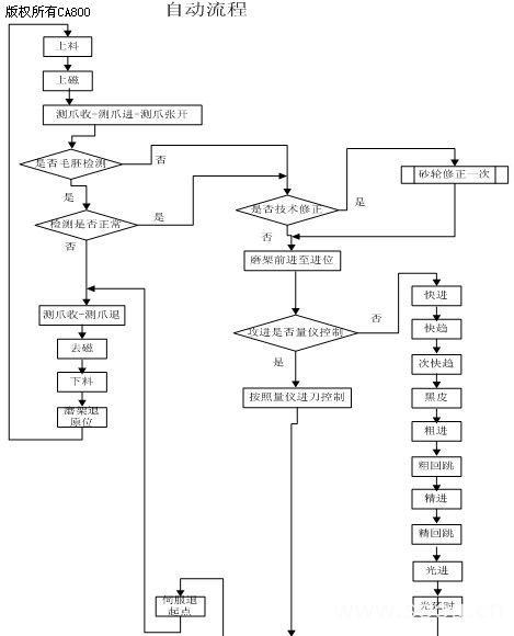 图2为自动流程框图,自动运行条件若满足,按启动 机台便在自动运行中循环运转,直到按停止进入停止流程,或者出现重要报警或紧急复位时自动运行终止。